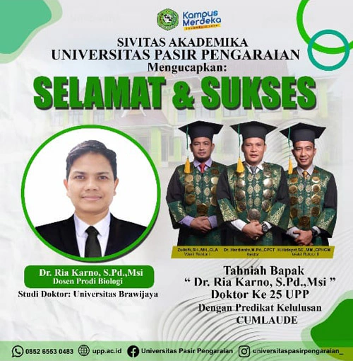Dengan kebarhasilan Dr. Ria Karno S.Pd., M.Si. menyandang gelar Doktor, sehingga menambah angka jumlah dosen di Universitas Pasir Pengaraian (UPP) Kabupaten Rokan Hulu (Rohul), Provinsi Riau sebanyak 25 orang.