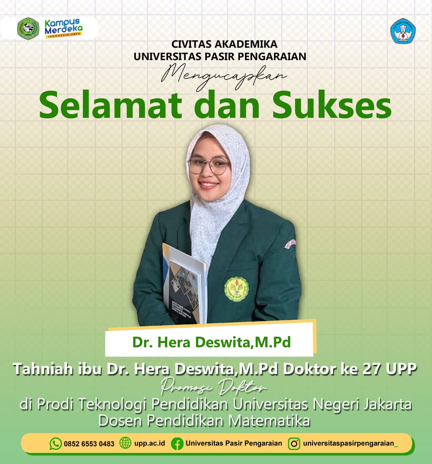 Berbagai kalangan banyak menyampaikan ucapan selamat sukses terhadap dirinya, termasuk keluarga besar civitas akademika Universitas Pasir Pengaraian yang juga ikut menyampaikan ucapan selamat dan sukses kepada Dr. Hera Deswita, M.Pd atas dipromosinya gelar doktoral tersebut.